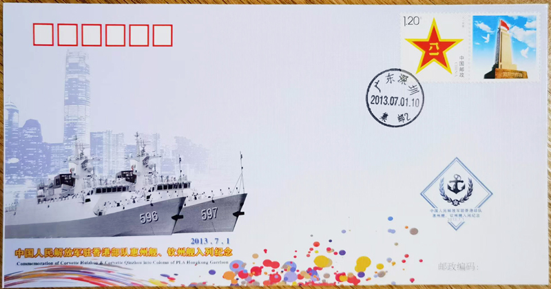 1997年駐港部隊進駐香港時,是當時全軍唯一一支三軍合成的部隊,分別代表着國家對香港領土、領海、領空的主權。駐港海軍雖然冠名“艦艇大隊”,但只有幾百噸的導彈護衞艇,連一艘艦都沒有。直到2013年七一,056型輕型護衞艦惠州艦、欽州艦入列,駐港海軍才真正由“艇”變“艦”、名副其實了。毫無疑問,我也收藏了惠州艦、欽州艦入列的首日封,記錄下這個歷史的瞬間。
