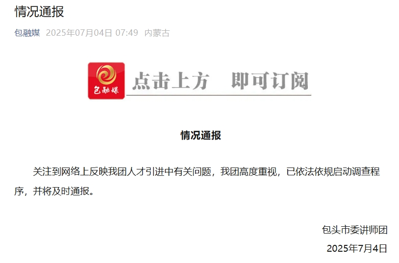 7月4日,包頭市融媒體中心微信公眾號發佈情況通報,包頭市委講師團表示已經關注到網絡上反映我團人才引進中有關問題,我團高度重視,已依法依規啓動調查程序,並將及時通報。