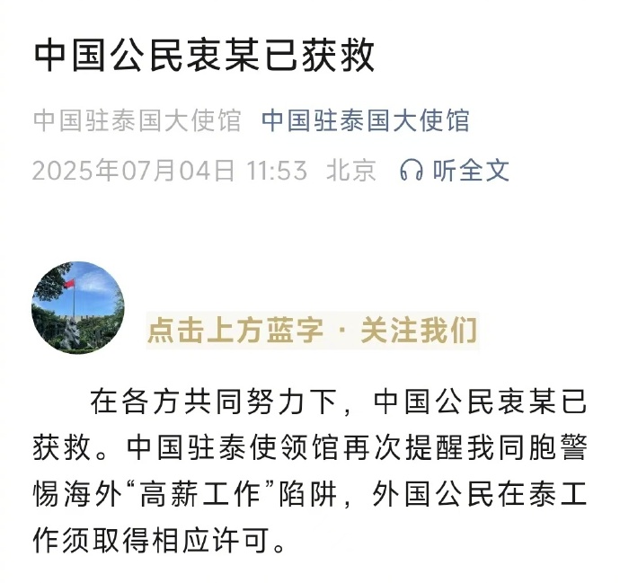 據中國駐泰國大使館微信公眾號7月4日消息,在各方共同努力下,中國公民衷某已獲救。中國駐泰使領館再次提醒我同胞警惕海外“高薪工作”陷阱,外國公民在泰工作須取得相應許可。