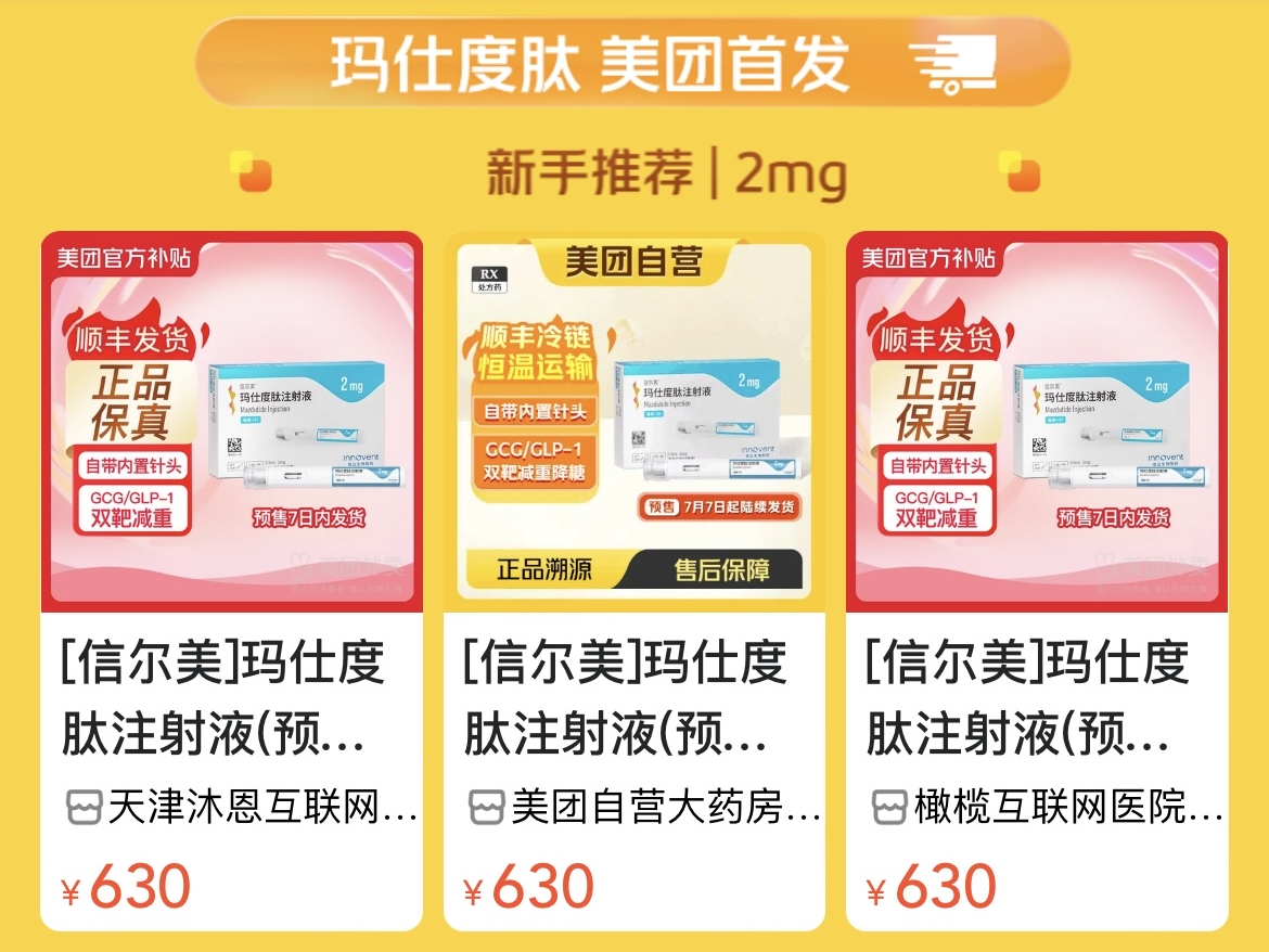 7月4日,觀察者網從美團方面獲悉,剛剛獲批的減重創新藥物瑪仕度肽注射液(商品名:信爾美®)已在美團醫藥健康旗下美團自營大藥房首發上線。患者可在美團搜索“瑪仕度肽”自行開方購買。