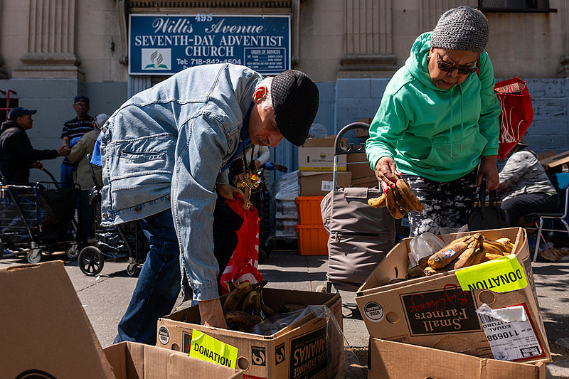 當地時間2025年4月23日,美國紐約,民眾在布朗克斯一座教堂外領取食物。 視覺中國
