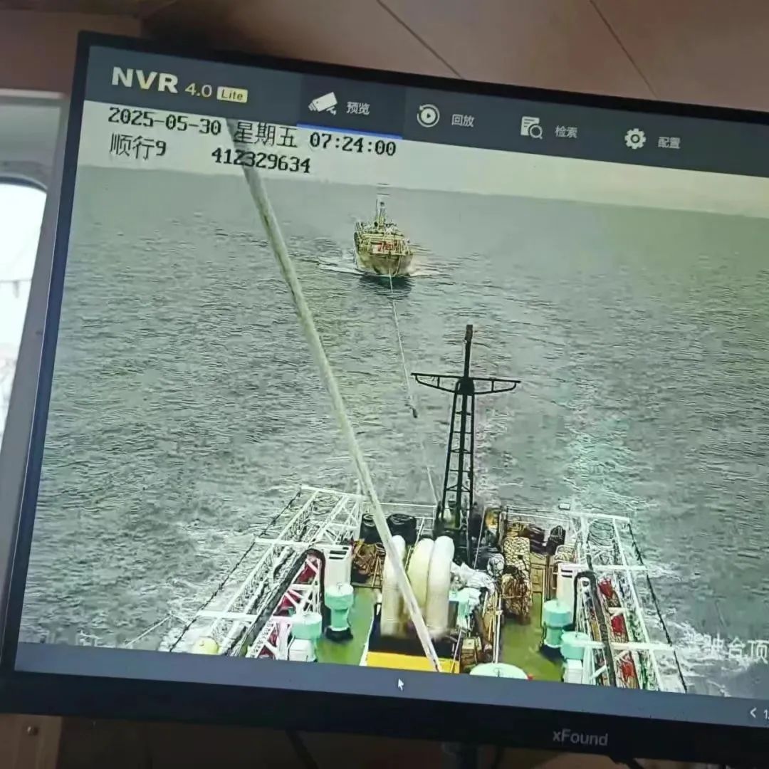 接到值班瞭望員的通知以後,張偉發出馬上調頭指令。同時對方漁船把救生衣燈捆綁在浮球上,再把浮球連接在拖帶纜繩上。漆黑的夜晚,“順行9”號船在海上努力尋找並撿起發光的浮球,再把斷了的拖帶纜繩捆綁好,歷時4個多小時,再次拖着“日大展”號漁船繼續前行。