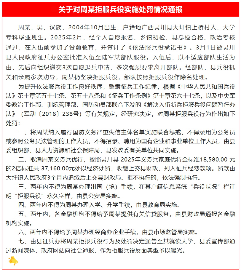 周某,男、漢族,2004年10月出生,户籍地廣西靈川縣大圩鎮上橋村人,大學專科畢業班生。2025年2月,經個人自願報名、鄉鎮初檢、縣總檢合格、政治考核通過,在入伍前參加了役前教育,並簽訂了《依法服兵役承諾書》。3月1日被靈川縣人民政府徵兵辦公室批准入伍至陸軍某部隊服役。入伍後,以不適應部隊生活為由,先後向組織遞交3次自願退兵申請、多次強烈要求離開部隊。經部隊、縣兵役機關和親屬多次勸導,周某仍堅決拒服兵役,部隊按照拒服兵役作除名處理。為提升依法服兵役工作良好秩序,整肅徵兵工作紀律,根據《中華人民共和國兵役法》第十章第五十七條、第五十八條和《徵兵工作條例》第十章第六十七條,以及中央軍委政治工作部、訓練管理部、國防動員部聯合下發的《解決入伍新兵拒服兵役問題暫行辦法》(軍動〔2018〕238號)等有關規定,經研究決定,對周某拒服兵役行為作出如下處罰: