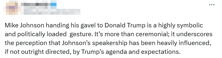 “約翰遜將議事槌交予特朗普,這一姿態極具象徵意義,且飽含政治深意。它遠非單純的儀式性舉動,更凸顯出一種普遍認知:約翰遜的議長職權即便未被特朗普的議程與訴求直接操控,也深受其左右。”