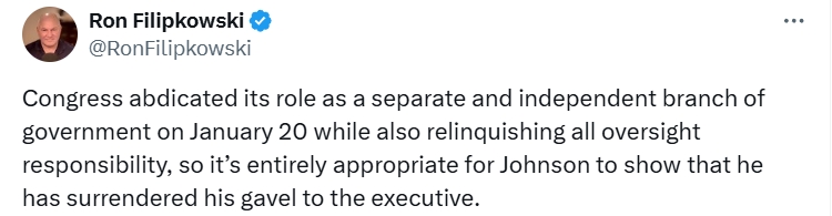 美國前聯邦檢察官、自由派媒體Meidas Touch Network的主編羅恩·菲利普科夫斯基也嘲諷道,“(今年)1月20日,國會就已經放棄了自身作為獨立分支的職能,同時也推卸了所有監督責任。如此一來,約翰遜向行政分支交出議事槌,反倒顯得‘順理成章’ 了。”