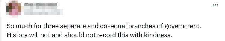 社交媒體上四處可見“道心破碎”的抨擊言論,“三權分立、相互制衡的政府架構,不過爾爾。歷史不會、也不應寬容地記錄下這一幕。”