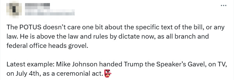 “總統根本不關心法案的具體內容,也不在乎任何法律。他現在凌駕於法律和規則之上,所有部門和聯邦部門的負責人都對他唯命是從。這就是一個最新例子。”