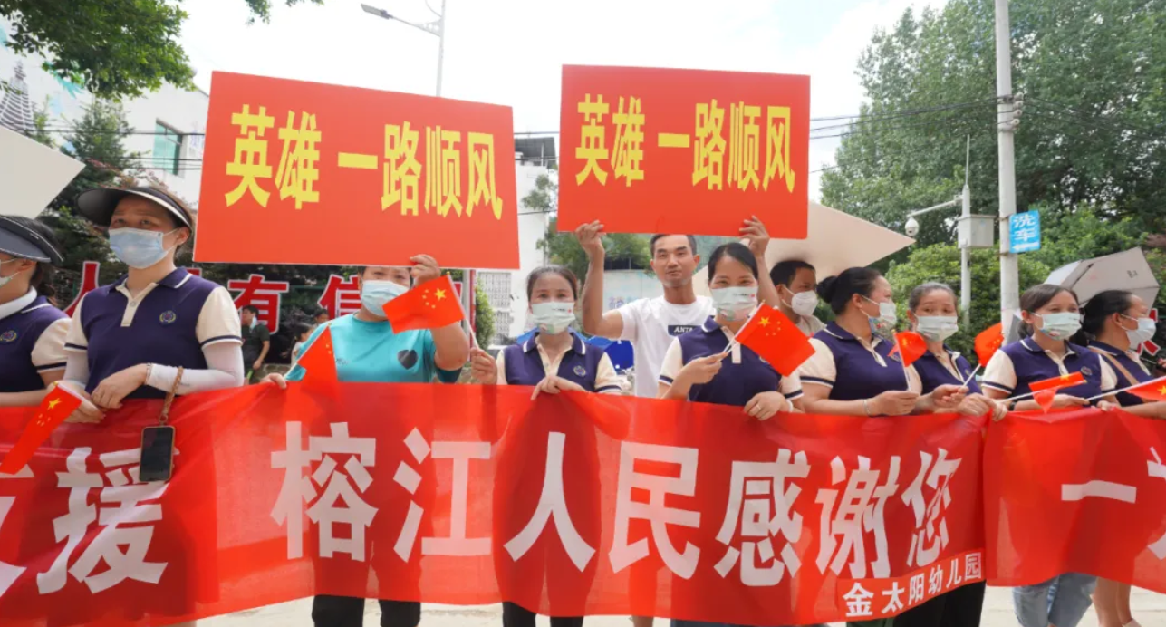 紅七軍廣場上,《沒有共產黨就沒有新中國》《侗歌聲聲唱給黨》的旋律此起彼伏,“榕江人民,感謝你們”的呼喊響徹雲霄。車內隊員伸出手與羣眾擊掌,向這座奮戰過的城市揮手告別。車外羣眾難捨難分、熱淚盈眶,榕江人民永遠銘記這份恩情,期待英雄們以遊客的身份再次回來。