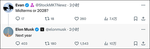 馬斯克也在評論區回答了外國網友們的一些關於“美國黨”的提問。有網友問道,這會是一個“減少債務只負責任地花錢、用人工智能或機器人對軍隊進行現代化改造、支持科技加速發展人工智能、對包括能源在內的廣泛領域減少監管……”的政黨嗎?馬斯克回覆説:“是的。”他還表示,該政黨將參加明年的中期選舉。