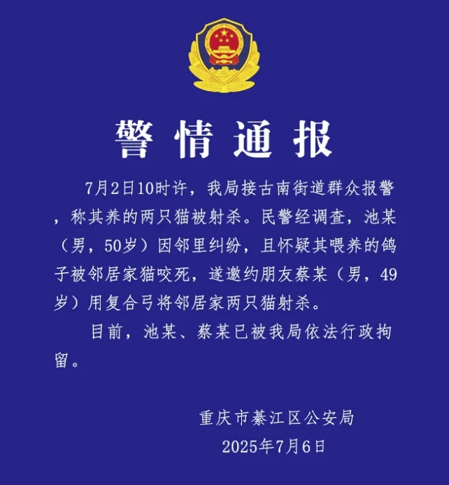 7月6日,重慶市綦江區公安局微信公眾號“平安綦江”發佈警情通報稱,7月2日10時許,我局接古南街道羣眾報警,稱其養的兩隻貓被射殺。民警經調查,池某(男,50歲)因鄰里糾紛,且懷疑其餵養的鴿子被鄰居家貓咬死,遂邀約朋友蔡某(男,49歲)用複合弓將鄰居家兩隻貓射殺。目前,池某、蔡某已被我局依法行政拘留。