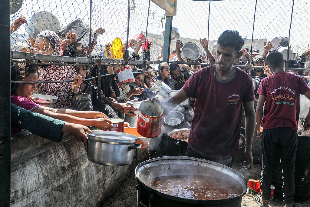 當地時間2025年7月3日,加沙地帶汗尤尼斯,巴勒斯坦民眾聚集領取食物 視覺中國