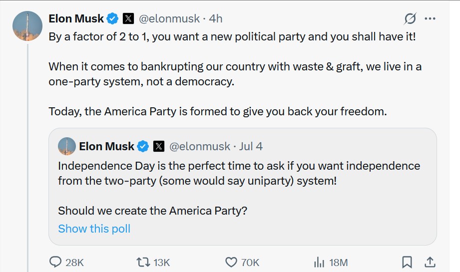 目標很明確:反對特朗普的“大美麗法案”(One Big Beautiful Bill Act),再通過組建一個真正的第三黨來影響政治,號召支持者們擺脱兩黨體系: