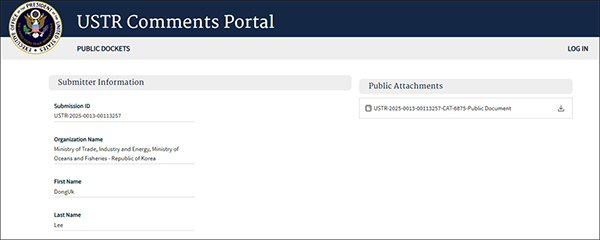 美國貿易代表辦公室網站顯示,韓國產業通商資源部和海洋水產部提交了意見書。