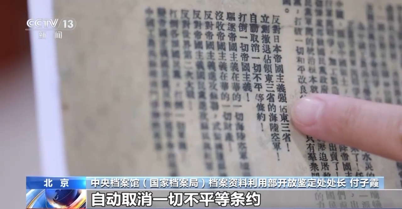 中央檔案館(國家檔案局)檔案資料利用部開放鑑定處處長付子霞:在這份檔案中,我們可以看到中共中央呼籲反對日本帝國主義強佔東三省,立刻撤退佔領東三省的海陸空軍,自動取消一切不平等條約。通過這份宣言,我們可以看到中國共產黨明確的抗戰主張。
