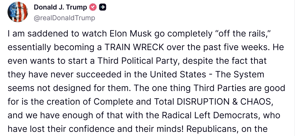此前,特朗普在“真實社交”平台罕見地發佈了一則超長的帖子,並在其中稱“馬斯克已經徹底‘脱軌’,在過去五週裏幾乎成了一列失事列車,我深感痛心。“特朗普還補充稱,“他(馬斯克)甚至想組建第三政黨,儘管這類政黨在美國從未成功過——體制似乎壓根就不是為它們設計的。”
