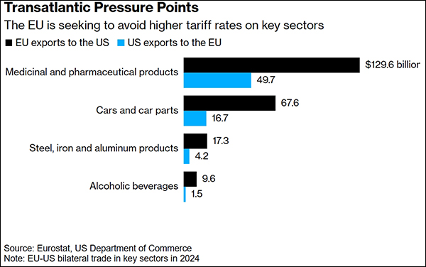 據美聯社報道,2024年,歐盟與美國的商品和服務貿易總額達到1.7萬億歐元,相當於每天平均約46億歐元。美國是歐盟最大的出口市場,歐盟的主要出口商品包括藥品、汽車、飛機、化學品、醫療器械以及葡萄酒和烈酒,而美國對歐出口則以原油、藥品、飛機、汽車及醫療設備為主。