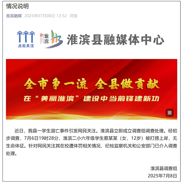 近日,我縣一學生溺亡事件引發網民關注。淮濱縣立即成立調查組調查處理。經初步調查,7月6日19時28分,淮濱二小六年級學生蔡某某(女,12歲)被打撈上岸,無生命體徵。針對網民關注其在校遭體罰相關情況,紀檢監察機關和公安部門已介入調查處理。