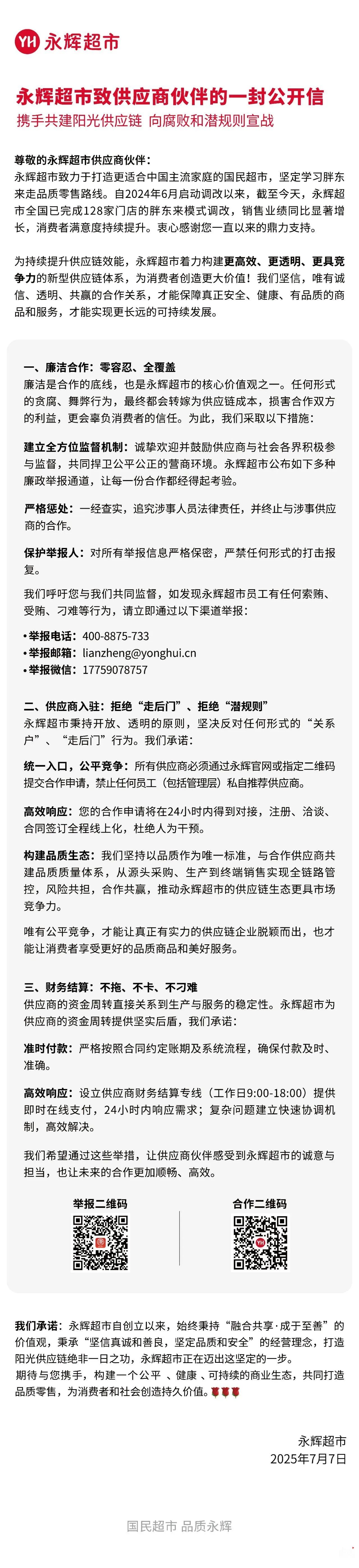 7月7日,永輝超市發佈《致供應商夥伴的一封公開信》稱,向腐敗和潛規則宣戰。永輝超市表示,任何形式的貪腐、舞弊行為,最終都會轉嫁為供應鏈成本,為此公司採取了建立全方位監督機制、嚴格懲處和保護舉報人等措施。