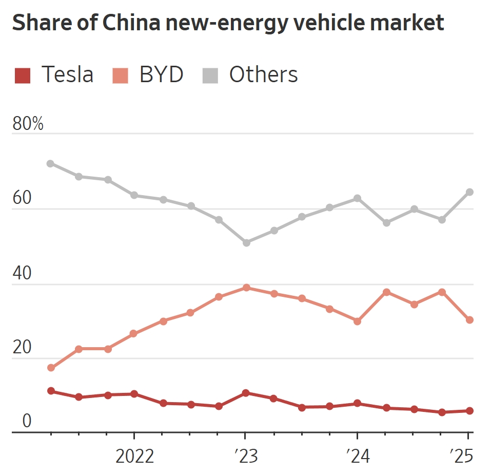 特斯拉和比亞迪在中國新能源汽車市場所佔份額的變化。 《華爾街日報》截圖