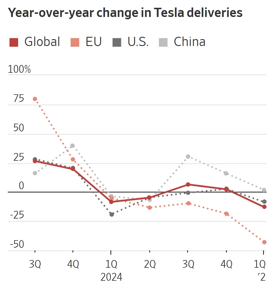 特斯拉在中美歐銷量均下滑 《華爾街日報》製圖