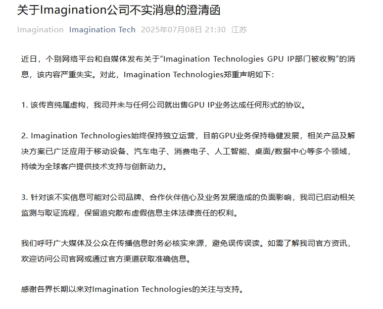 Imagination Technologies還呼籲,“廣大媒體及公眾在傳播信息時務必核實來源,避免誤傳誤讀。”