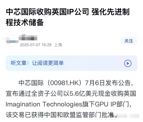 近期,有自媒體發佈消息稱,“中芯國際7月6日發佈公告,宣佈通過全資子公司收購英國Imagination Technologies GPU IP部門,該交易已獲得中國和歐盟監管部門的批准”。