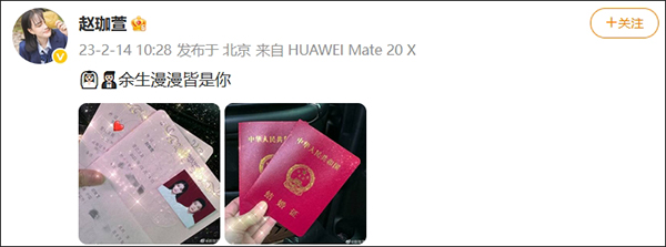 據九派新聞報道,她還在其他平台也發佈了結婚領證的消息,曬出多張夫妻甜蜜合照寫道:“無論是順境或者逆境、富俗或者貧窮、健康或者疾病、快樂或者憂愁,我都永遠愛着您、珍惜您,對您忠實,直到永永遠遠。”