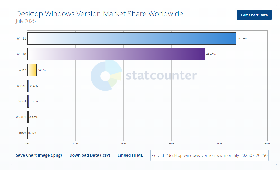 7月9日,據Statcounter數據顯示,在發佈四年後,Windows11如今以約52%的市場份額首次超越Windows10,成為全球範圍內第一大Windows操作系統。