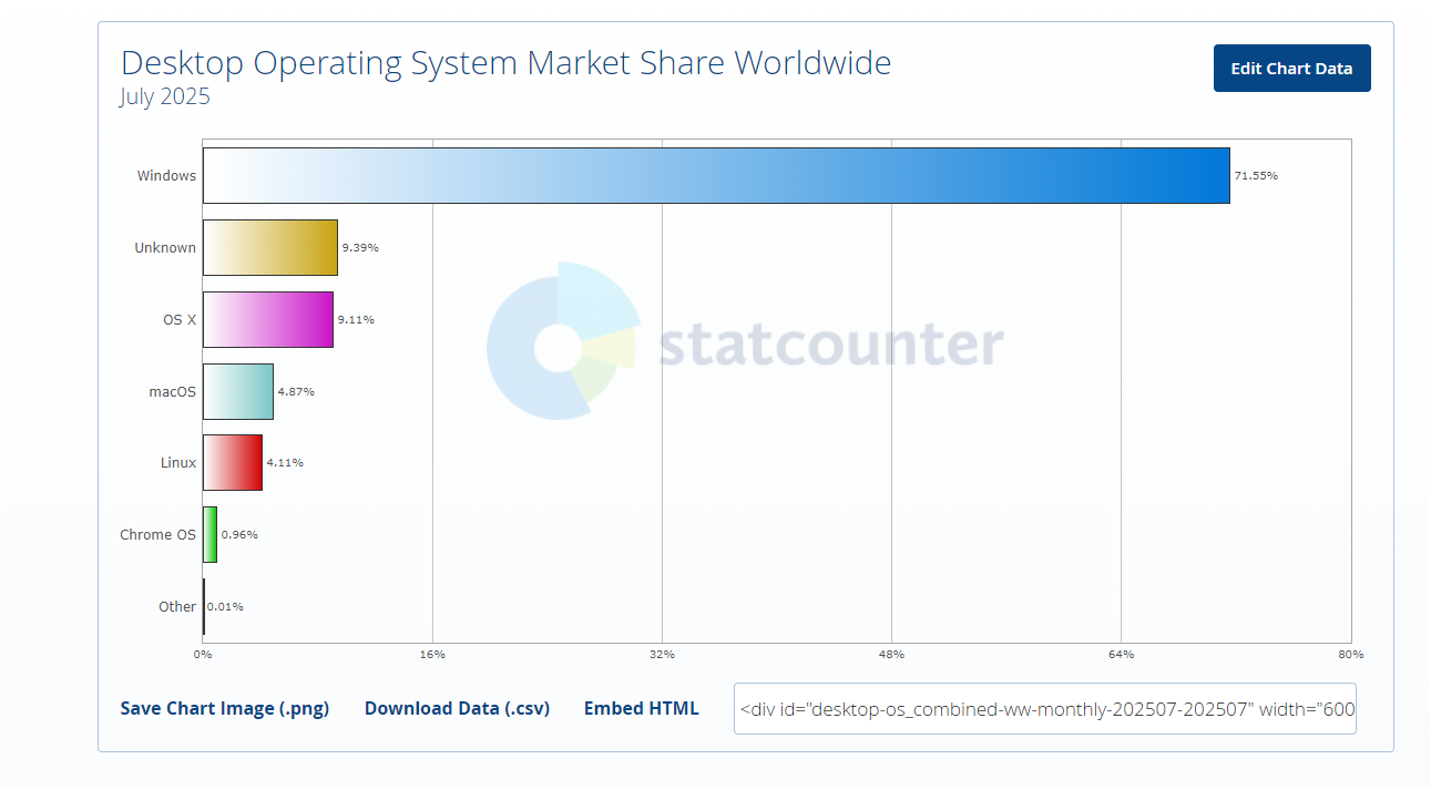 從全球桌面操作系統整體來看,Windows系統在7月擁有71.55%的佔比,OS X佔比9.11%,macOS佔比4.87%,Linux佔比4.11%,Chrome OS佔比0.96%,Windows11也由此成為全球第一大桌面操作系統。