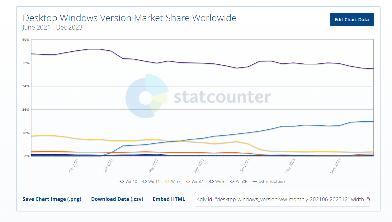 Windows11自2021年上市以來,到2022年12月僅佔據了不到10%的市場份額。自那時起,Windows11的市場份額一直緩慢而穩定地增長。2023年12月,Windows11的市場份額為26.54%
