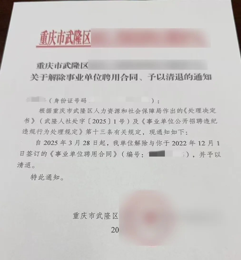 程文皓向中國新聞週刊出具的文書顯示,2025年1月2日,武隆區人力資源和社會保障局決定給予其當次全部科目考試成績無效處理,並將其違紀違規行為記入事業單位公開招聘應聘人員誠信檔案庫,期限為五年。