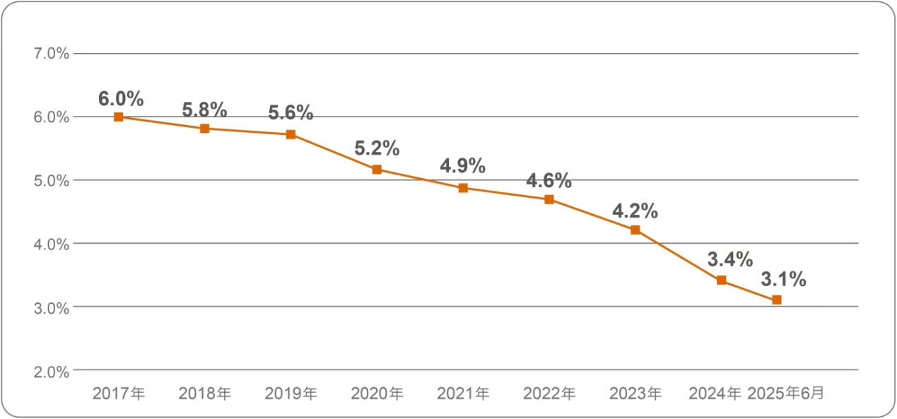 此外,濱江集團近年來的綜合融資成本也在不斷下降,貸款利率從2017年的6%逐年下降到2024年的3.4.%,2025年剛過半,融資利率已達3.1%,這個數字不僅在民營房企中一騎絕塵,甚至超過了很多國央企。