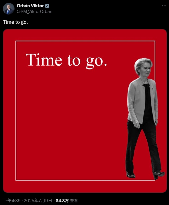 當地時間7月9日,匈牙利總理歐爾班在社交媒體X平台發文,並配了張馮德萊恩走出紅色框架的圖片。