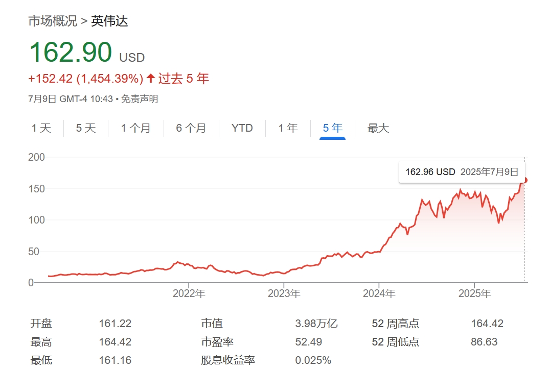 週三(7月9日)美股早盤,英偉達股價一度漲近2.8%至164.42美元,總市值短暫突破4萬億美元(約合28.7萬億元人民幣),成為全球第一家達到這一里程碑的公司。