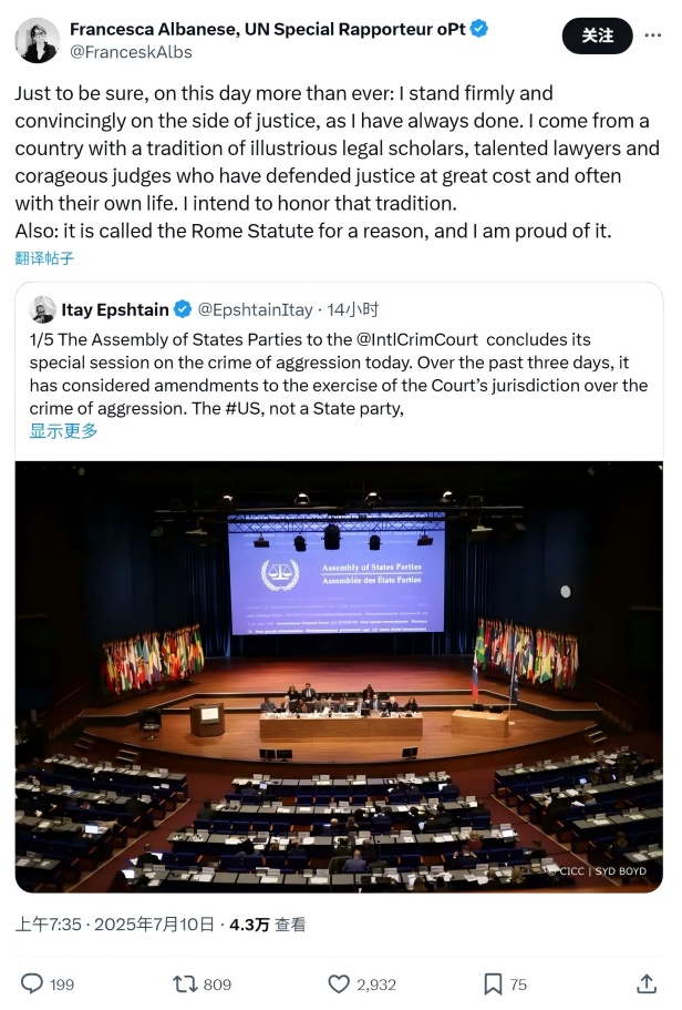 去年3月,阿爾巴尼斯表示,有“合理理由”相信以色列在加沙的行為符合種族滅絕的具體法律定義。毫不令人意外的是,美國和以色列對此堅決否認。美國國務卿魯比奧表示:“阿爾巴尼斯直接與國際刑事法院(ICC)合作,調查、逮捕、拘留或起訴美國或以色列國民”,並指責她身上有着“毫無掩飾的反猶太主義”。