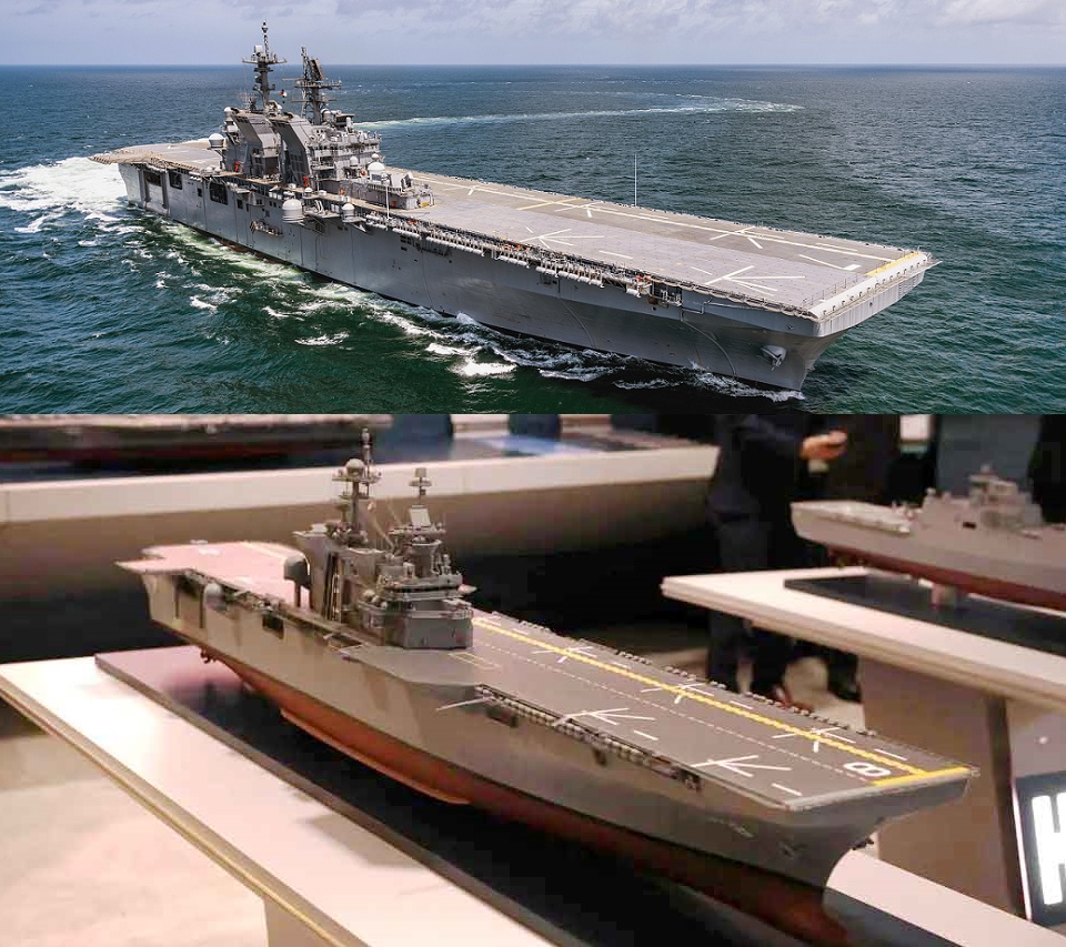 相比於基本型“美國”級(上圖),FlightⅠ批次(下圖,2024年美國海軍水面艦艇年會官方模型)明顯增加了一處右舷甲板,並取消了艦島前方的武器平台