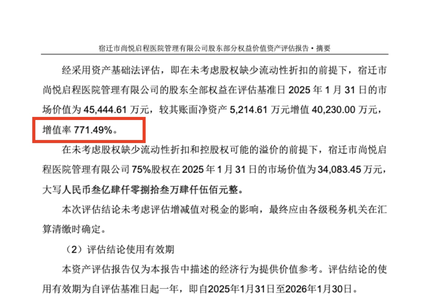 歐普康視此次收購的標的公司尚悦啓程成立於2024年5月,雖然成立時間較短,但其核心資產昆明星程眼科醫院已在昆明地區建立了較為完整的醫療服務網絡。根據評估報告,尚悦啓程股東權益評估值達4.54億元,較賬面淨資產增值4.02億元,增值率高達771.49%。