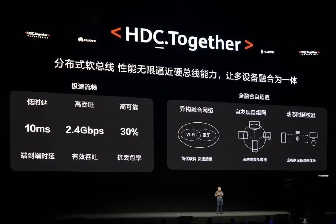 **王成錄:**鴻蒙並非因為制裁而倉促啓動,早就準備好了,2019年只是順理成章的發佈節點。2017年7月我們給任總做彙報,非常成功。大家最不理解的,其實是“軟總線”這個概念。哪怕今天講的“碰一碰”,很多人也只是略有理解,並不瞭解背後的深層邏輯。我記得給任總彙報,當時演示的一個核心場景特別形象,拿的是阿里的智能音箱。我們在這個音箱上放一首音樂,然後用手機靠近這個音箱,一旦軟總線連接上,音樂播放界面立刻就顯示在手機屏幕上,相當於給音箱“裝了一塊屏幕”。背後的邏輯是:通過軟總線,手機和音箱被“融合”為一台設備,手機變成音箱的控制界面。當把手機拿開,超出無線覆蓋範圍後,音樂依然繼續在音箱裏播放,這場演示幾乎讓在場所有人都“哇”了一聲。