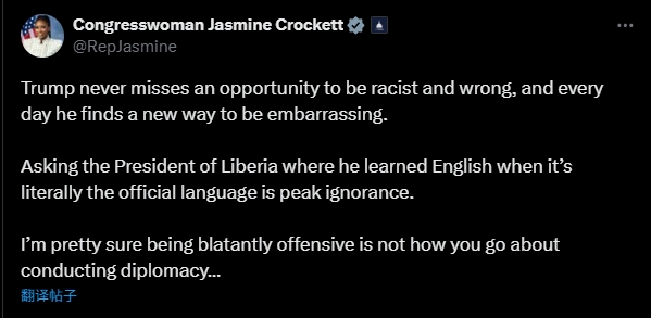 美國民主黨籍非裔國會眾議員賈斯敏·克羅克特在X上發文稱,特朗普“極度無知”。