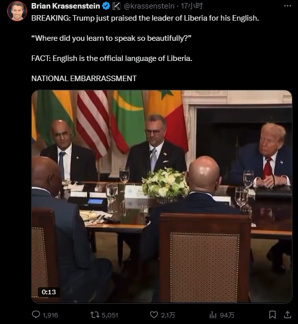 “特朗普剛剛稱讚利比里亞領導人的英語水平,‘你從哪兒學來的這麼流利的英語?’”X平台“網紅”布萊恩·克拉森斯坦寫道,“事實是,英語是利比里亞的官方語言。國家恥辱!”