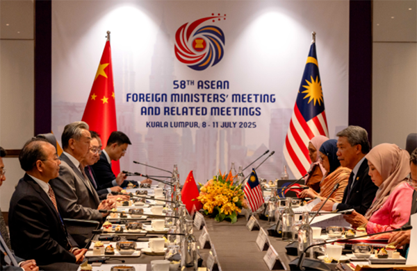 王毅表示,中國和東盟是好鄰居、好朋友、好夥伴。中國—東盟已全面完成10+1自貿區3.0版談判,以實際行動擴大共同市場,維護自由貿易。美國卻憑一紙信函向東盟國家徵收高關税,是典型的單邊霸凌行徑,沒有任何國家會認同支持。中方站出來堅定反制,不僅是為了維護自身利益,也是在維護包括東盟國家在內的各國共同利益。中方願同東盟加強合作,共同維護多邊貿易體制,維護全球產供鏈穩定,推動普惠包容的經濟全球化。