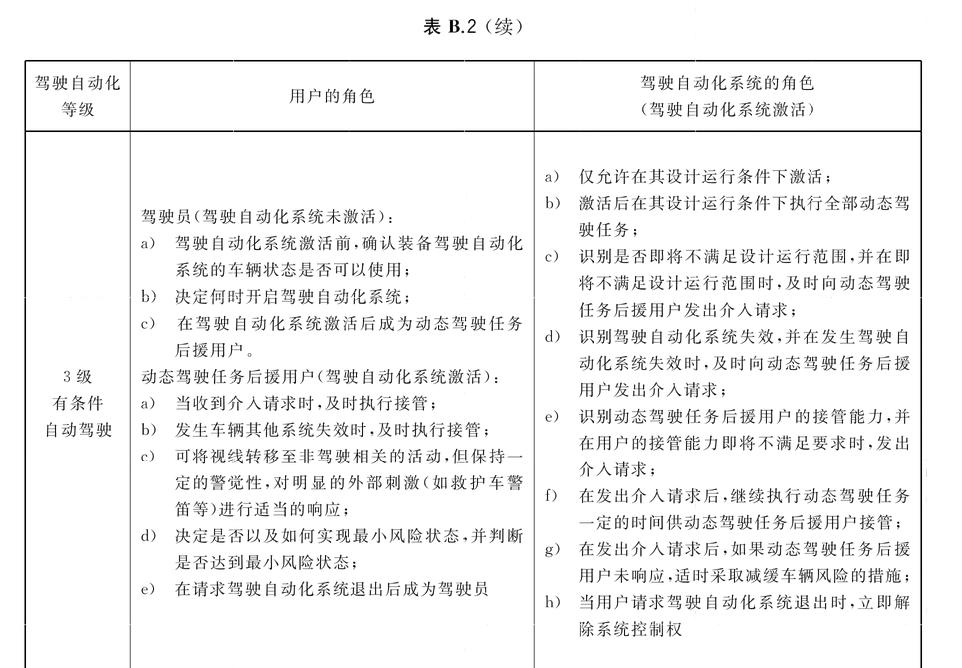國家標準《汽車駕駛自動化分級》(GB/T 40429—2021)中關於L3級“有條件自動駕駛”中用户與駕駛系統扮演的角色,其中並不存在餘承東所言“L3可以讓司機開車‘想睡就睡’”的條件 《汽車駕駛自動化分級》(GB/T 40429—2021)