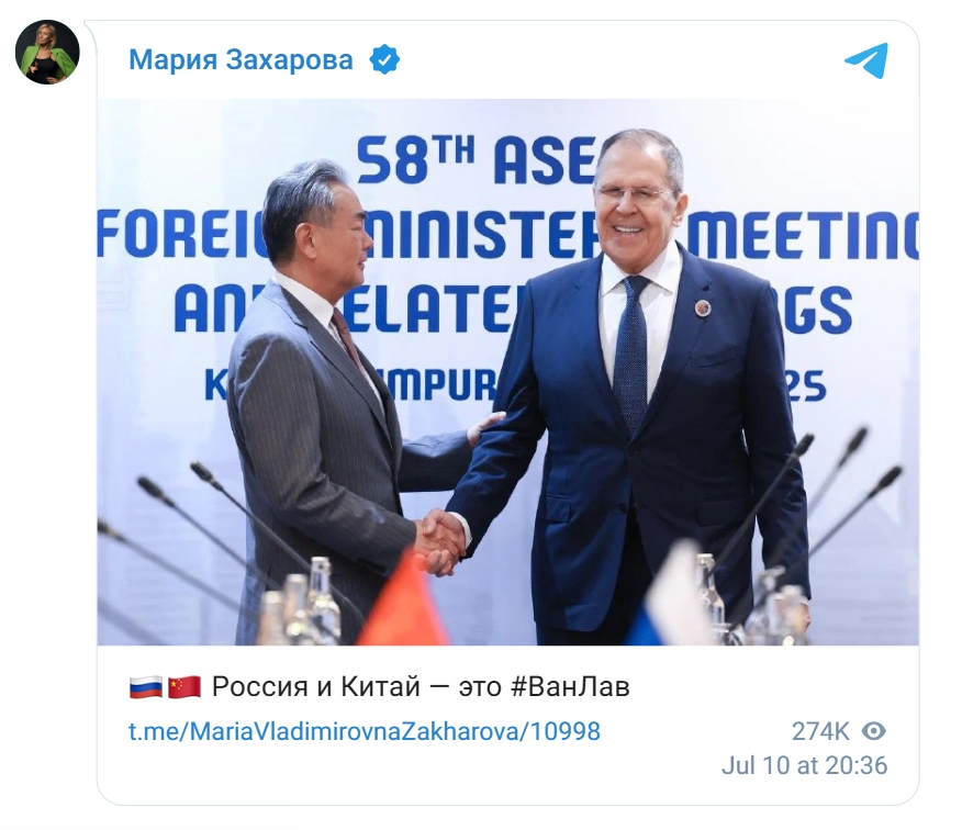 俄羅斯塔斯社報道,俄羅斯外交部發言人扎哈羅娃在她的電報賬號發佈俄中外長在吉隆坡的握手合照,並表示,俄中兩國之間的合作可以用“王拉夫”來形容。