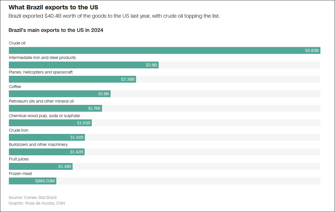 2024年,巴西主要出口到美國的商品包括原油,鋼鐵中間產品,鋼鐵、直升機和航天器,以及咖啡等 CNN