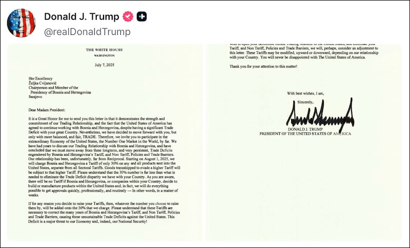 特朗普9日發佈的公開信 Truth Social