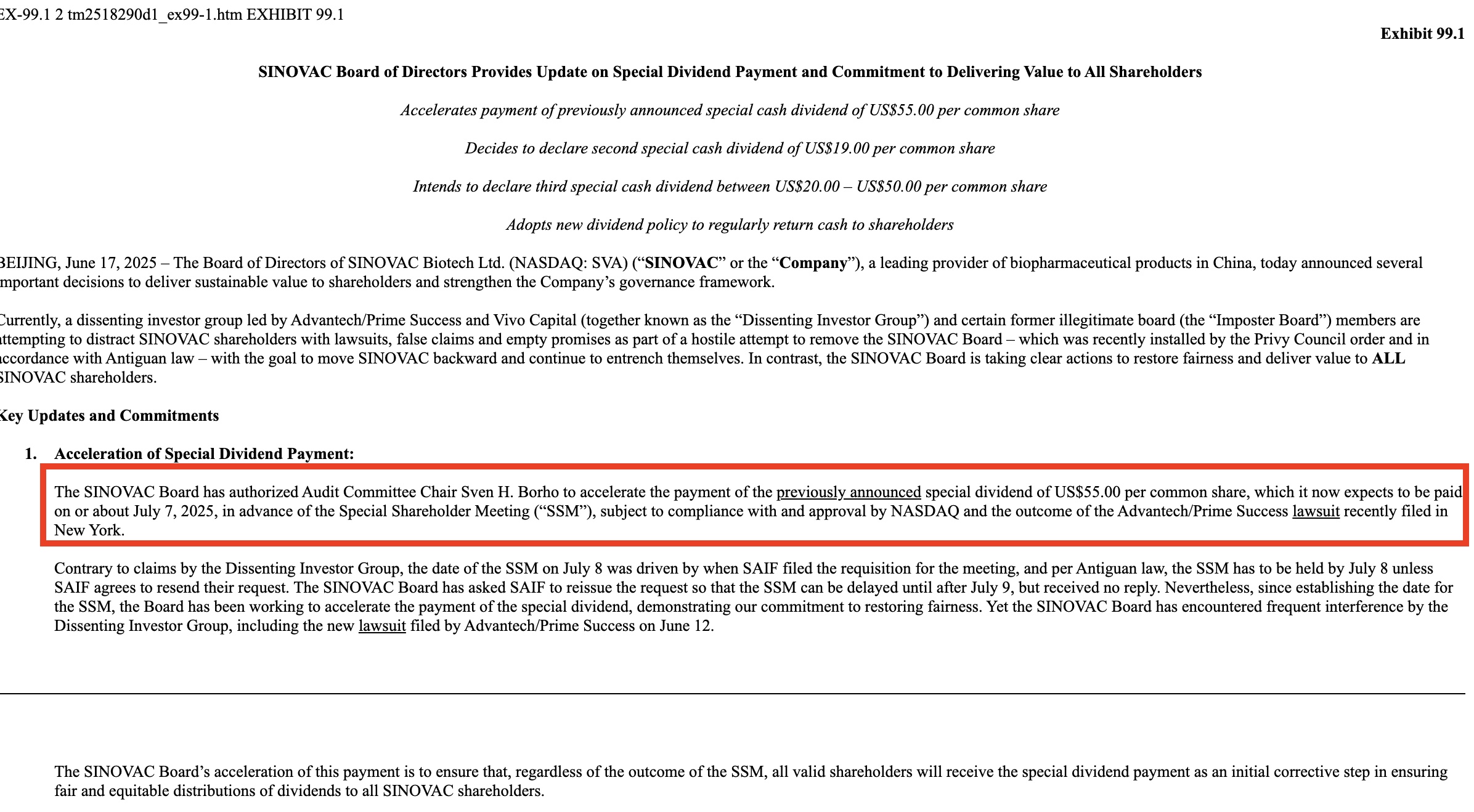 這場衝突的導火索源於科興生物於7月初拋出的“清倉式分紅”計劃——總額最高75億美元(約538億元人民幣),每股分紅上限達124美元,相當於停牌前股價6.47美元的19倍。首期每股55美元的股息已於股東大會前支付,股息率高達850%,逾33億美元現金湧入股東賬户。