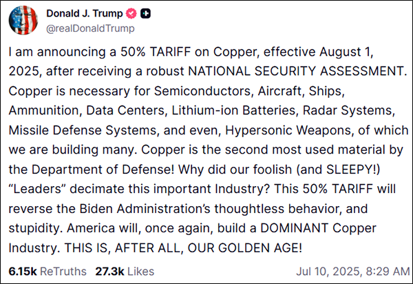 當地時間7月10日,美國總統特朗普在“真實社交”平台發文宣佈,將自8月1日起對所有進口銅徵收50%的關税。