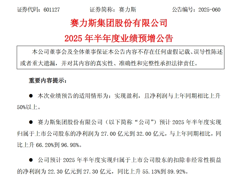 賽力斯集團披露2025上半年業績預增公告 賽力斯集團