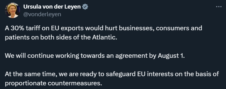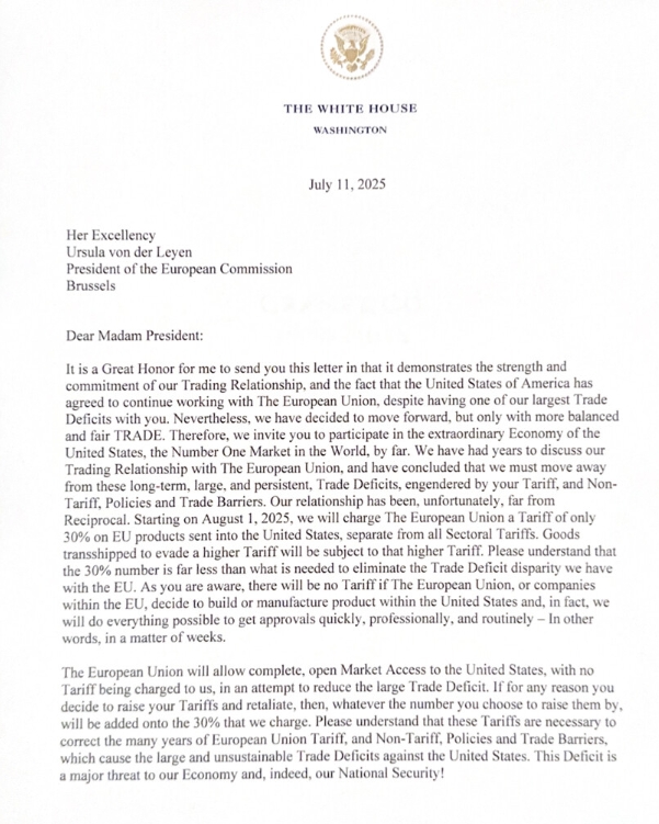 “多年來,我們一直在討論與歐盟的貿易關係,並得出結論,即美國必須擺脱由歐盟關税、非關税政策和貿易壁壘造成的長期、巨大且持續的貿易逆差,”特朗普在信中向馮德萊恩表示,“不幸的是,我們的關係遠非互惠互利。”