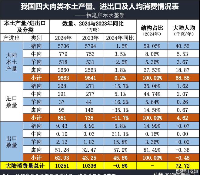 第四,那咱們實際的吃肉水平到底如何呢?可以算一下人均肉類佔有量,咱們先説豬肉。我國是全球斷崖式領先第一的生豬養殖大國,每年出欄是7億頭豬,可以説是人均萬頭豬。具體豬肉的產量,去年是5706萬噸,出口了不到3萬噸,進口了100多萬噸,如果包括各種內臟雜碎,進口是200多萬噸。算一下,我國人均佔有的豬肉是42公斤,光豬肉就已經超過39.8公斤了。